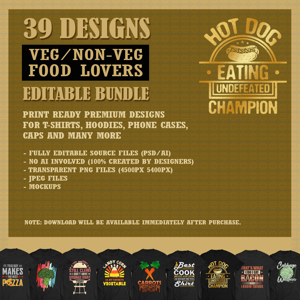 39 Editable Veg / Non-Veg Food Lovers T-Shirt Designs Bundle